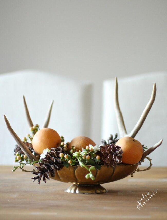 Bronze bowls cradle organic treasures like pinecones and citrus fruits, drawing curious eyes across their rich landscape.