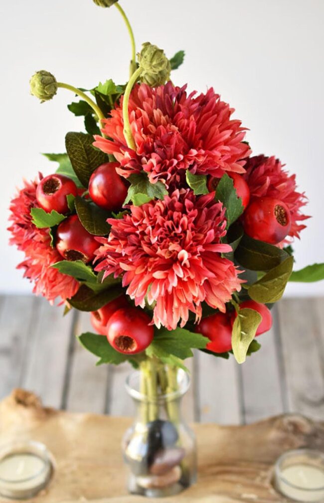 You can blend pumpkins, apples, and foliage alongside roses, dahlias, or chrysanthemums for arrangements bursting with character.