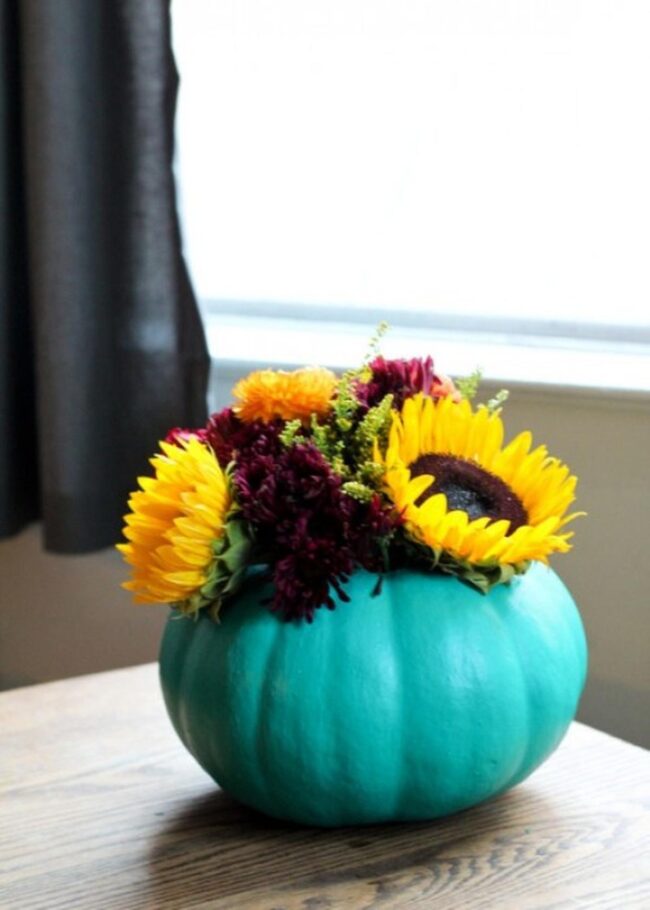 Sunflowers dancing with purple blooms nestled inside a teal pumpkin create pure magic for your living spaces.