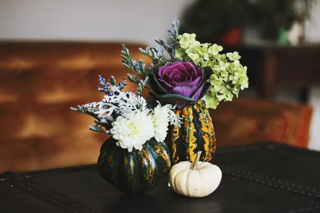 White pumpkins and green gourds become unexpected vases for delicate purple and pale green blooms, creating surprising visual symphonies.