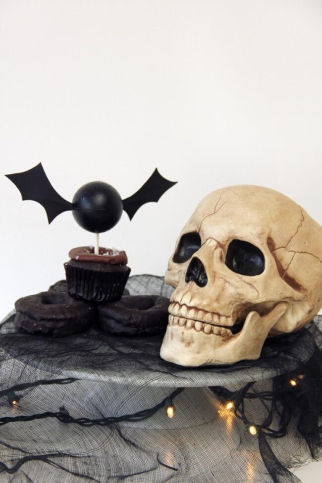 Intriguing elements like realistic skull centerpieces draw curious eyes across your delightful spread, while soft fairy lights dance around deep black and earthy beige backgrounds.