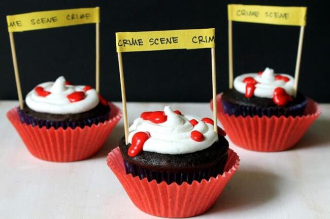 Bright red liners dramatically cradle these mysterious treats, ensuring each cupcake looks like a captivating forensic canvas.