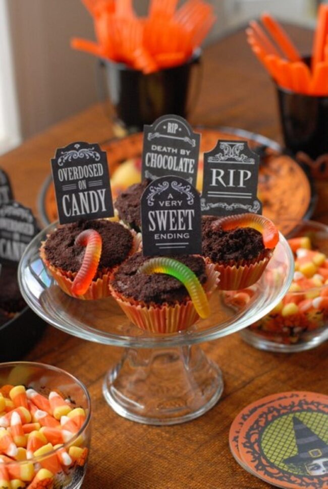 Clever little signs peek out between cupcakes, whispering Halloween magic and encouraging party guests to indulge in seasonal cheer.