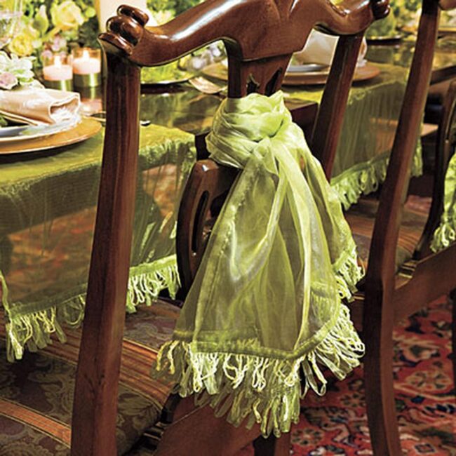 Soft green fabric with delicate fringe adorns chair backs, instantly elevating the room's emotional temperature.