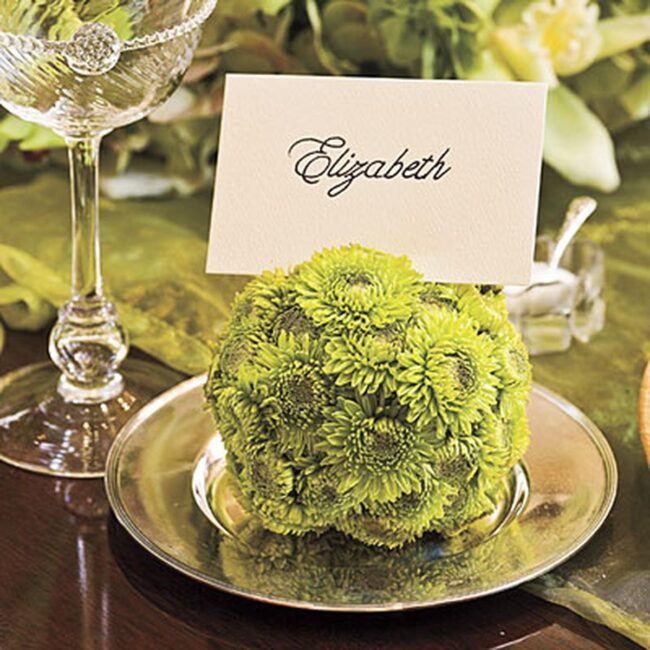 Delicate green florals tucked into crisp napkins bring natural charm to your table's landscape.