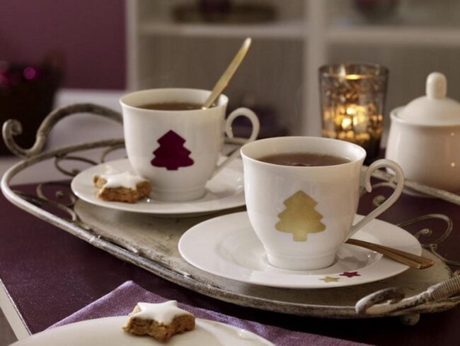 White porcelain tea cups with festive gold and red Christmas tree patterns shine brilliantly on a polished metal tray, instantly drawing your eye to their delicate design.