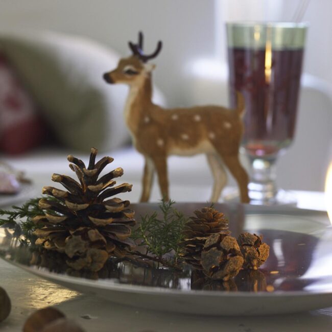 Woodland charm sneaks into your room through gentle deer figurines standing quietly beside carefully arranged decorative pieces.