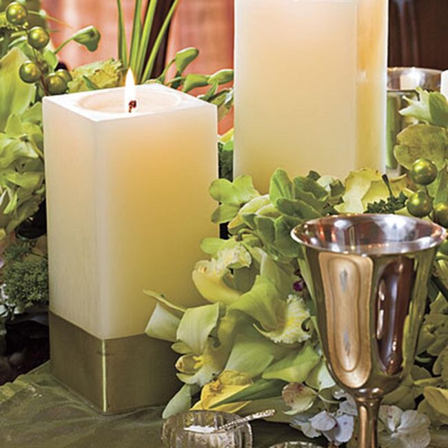 Gentle green leaves and pale yellow flowers wrap around golden candle bases, creating a natural harmony that feels both sophisticated and welcoming.