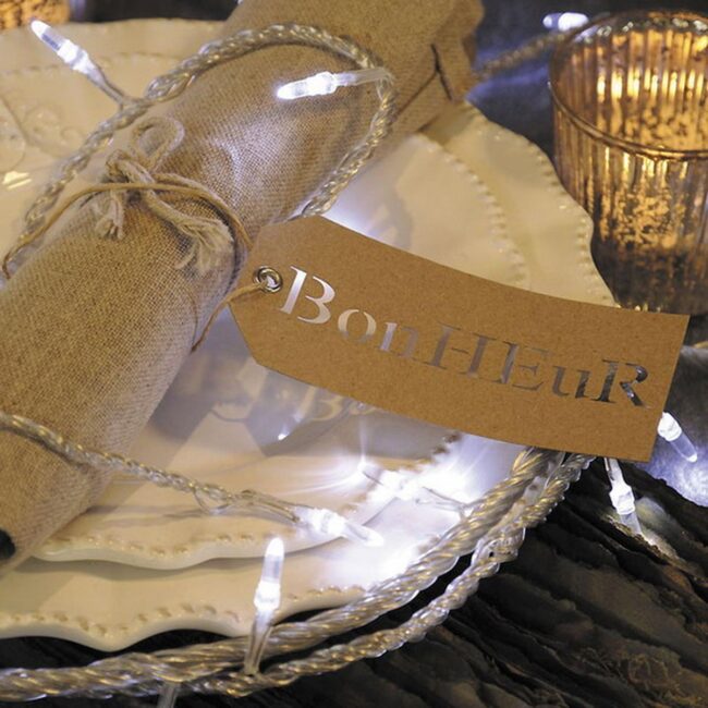 Soft string lights dance around delicate white plates, casting a gentle radiance that instantly draws your eye across the dining scene.