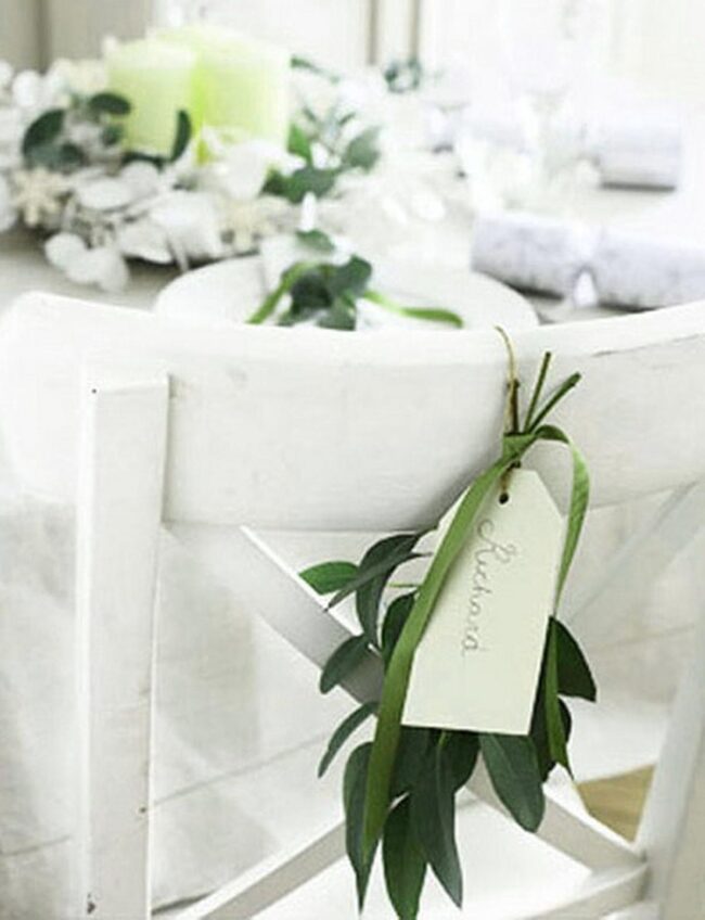 Soft green leaf decorations tied with delicate ribbons whisper natural beauty into every corner.