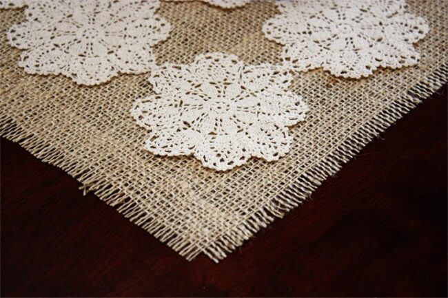 Soft white lace delicately dances across rough burlap, creating an eye-catching visual symphony that draws you closer to explore every intricate detail.