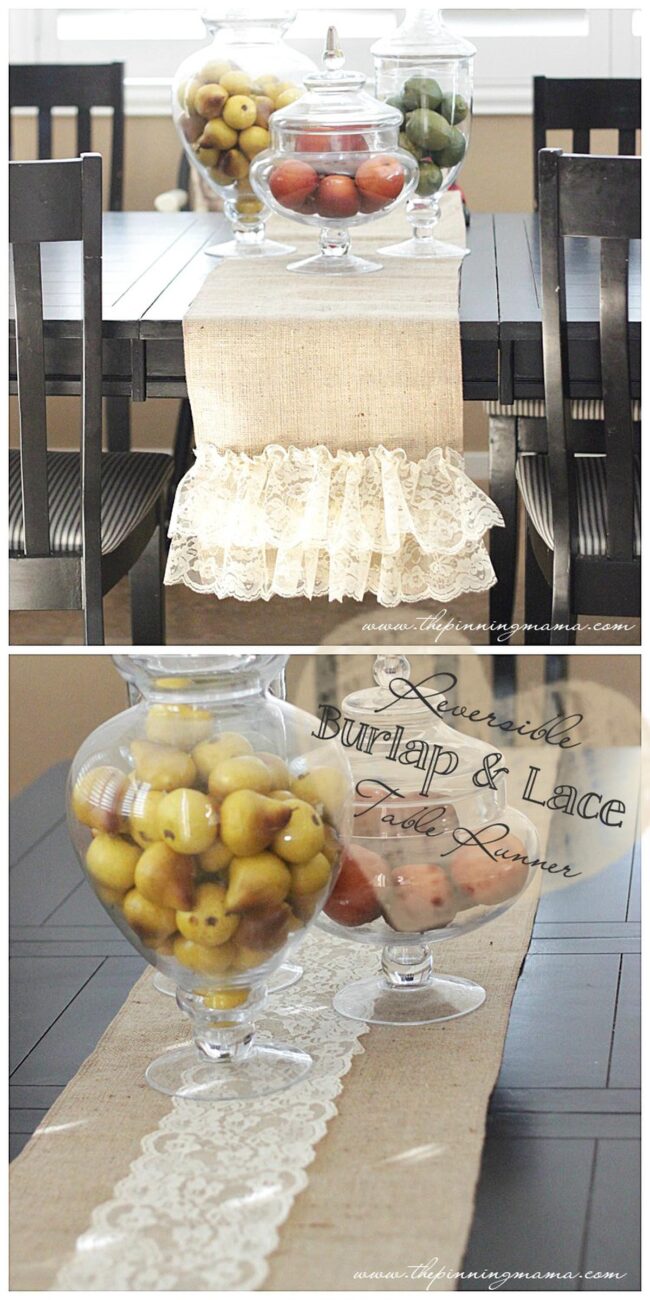 Softness arrives through delicate lace-trimmed burlap runners, adding unexpected charm to your tabletop landscape.