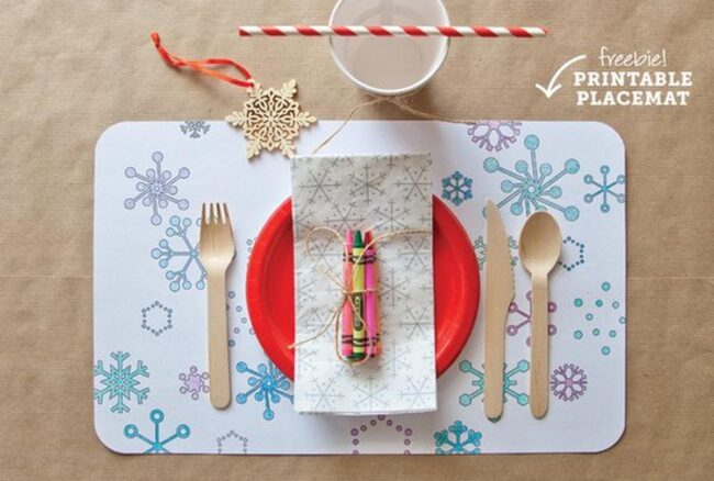 Snowflake-inspired placemats in cool blue and purple tones suggest winter's enchanting memories without overwhelming the scene.