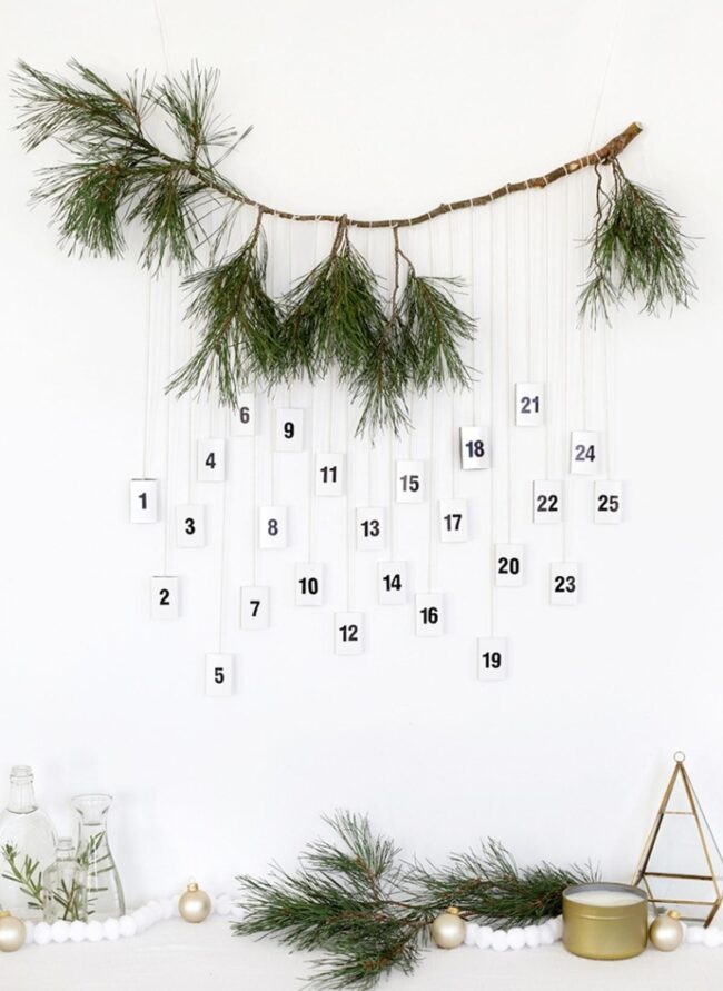 Sophisticated styling turns simple pine branches into enchanting countdown displays that draw eyes and spark curiosity.
