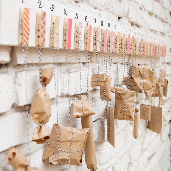 Carefully wrapped packages hang in perfect alignment, promising daily surprises that will make your heart flutter with anticipation.