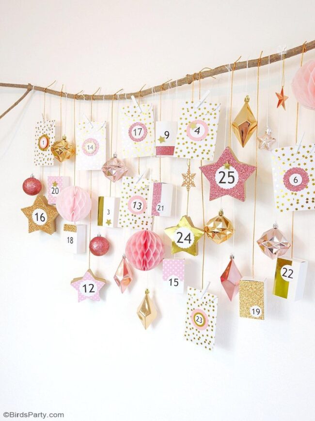 Delicate strings suspend numbered envelopes and boxes adorned with shimmering gold stars and soft pink dots.