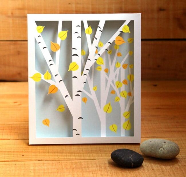 Delicate paper cutouts dance with golden leaves swirling around branches, inviting your eyes to explore every intricate detail.