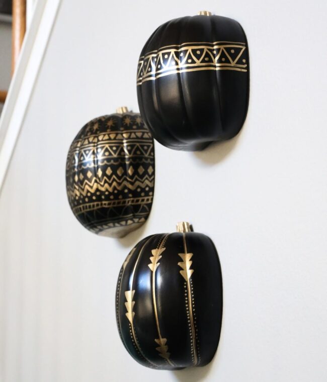 Sleek black pumpkins become your secret weapon for stunning seasonal decor, where golden metallic patterns dance across smooth surfaces like delicate art.