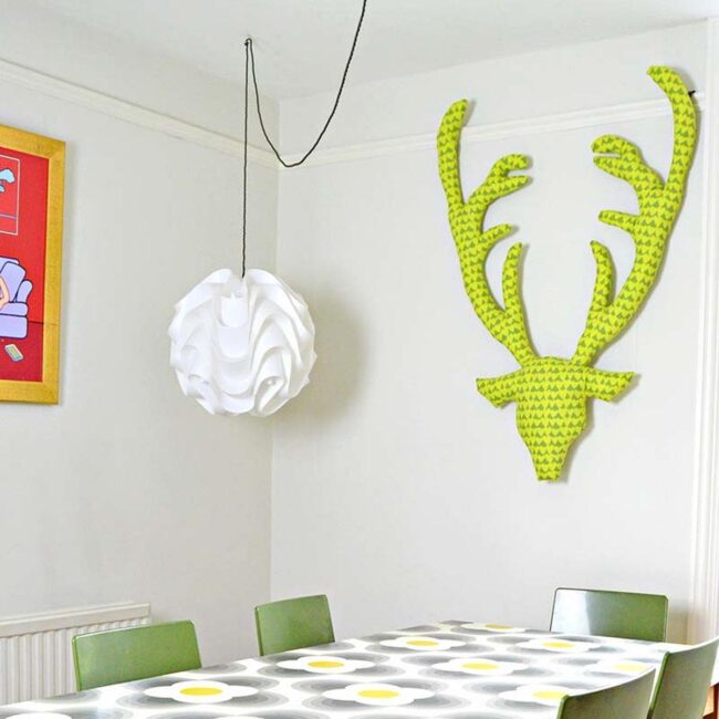 An unexpected deer head mounted on pristine white walls adds surprising personality, making guests wonder about your adventurous design spirit.