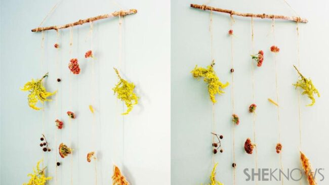 Soft strings delicately cradle dried botanical wonders, weaving intricate patterns of yellows, reds, and browns that dance with sunlight.