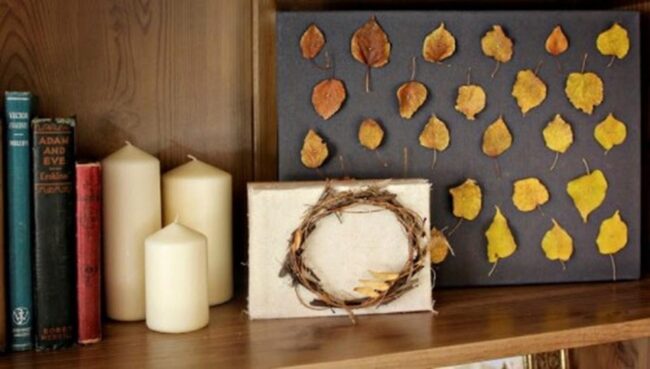Delicate canvas art featuring twig wreaths and pressed yellow leaves brings seasonal magic right to your wall.
