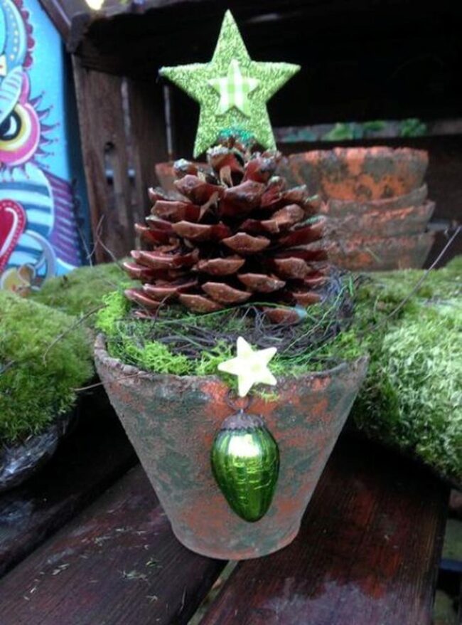 Metallic containers create striking visual contrast against natural pine cone textures, making each small tree feel like a precious holiday jewel.