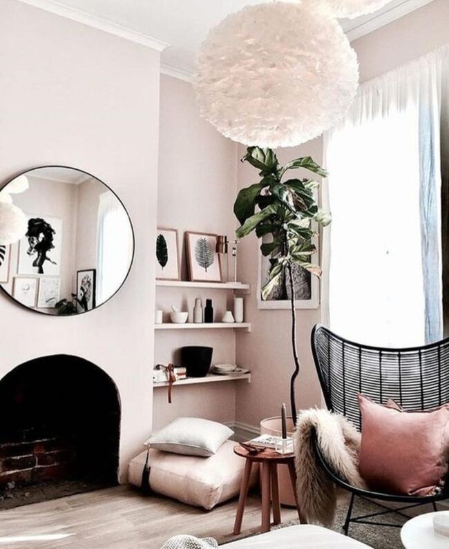 A round mirror above the classic fireplace adds architectural charm and visual intrigue, making the space feel larger and more dynamic.