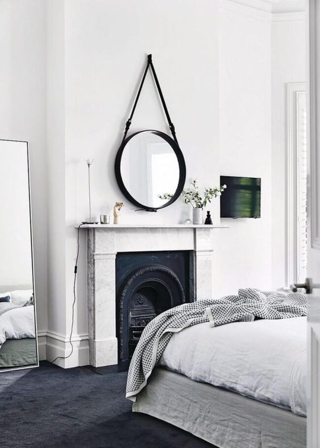 Round mirrors above empty fireplaces magically expand visual dimensions, reflecting beautiful artwork and making smaller rooms feel more spacious and open.