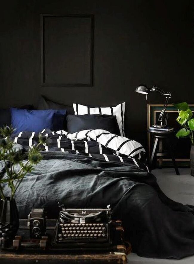 Midnight-toned walls merge seamlessly with matching furniture, creating an intense atmosphere where shadows dance and mystery whispers.