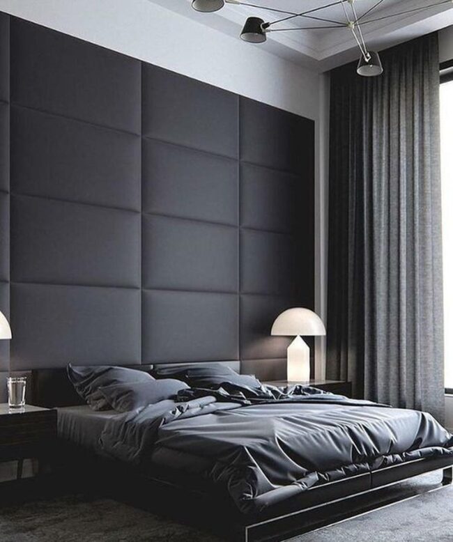 Padded wall panels in deep charcoal instantly elevate your sleeping space, offering a dramatic backdrop that embraces calm and mystery.