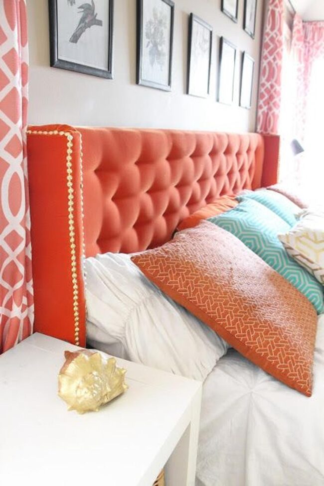 Bright orange headboards steal attention through charming button details that instantly draw wandering eyes.
