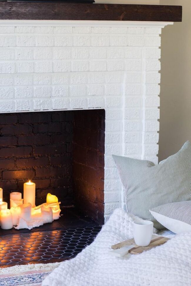 Gentle candlelight flickers inside the fireplace, casting mesmerizing shadows that whisper stories of quiet relaxation.
