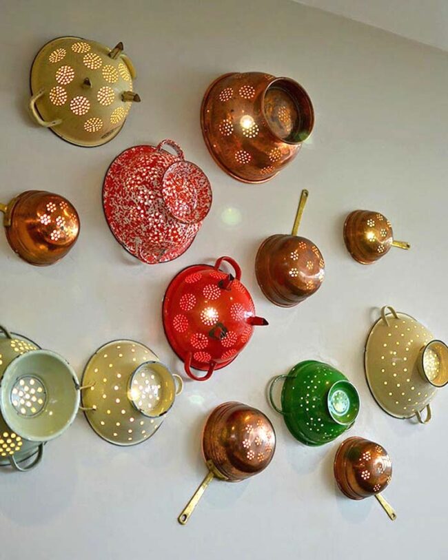 Discarded colanders become mesmerizing light fixtures that breathe new life into home decor, showcasing creativity and sustainability in one brilliant design.