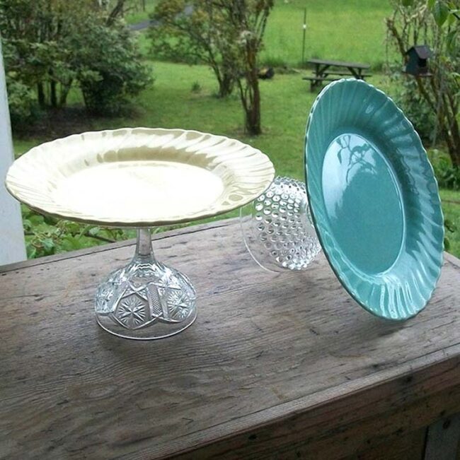 Glass goblets with intricate stem designs add extra personality and vintage charm to homemade cake stands.