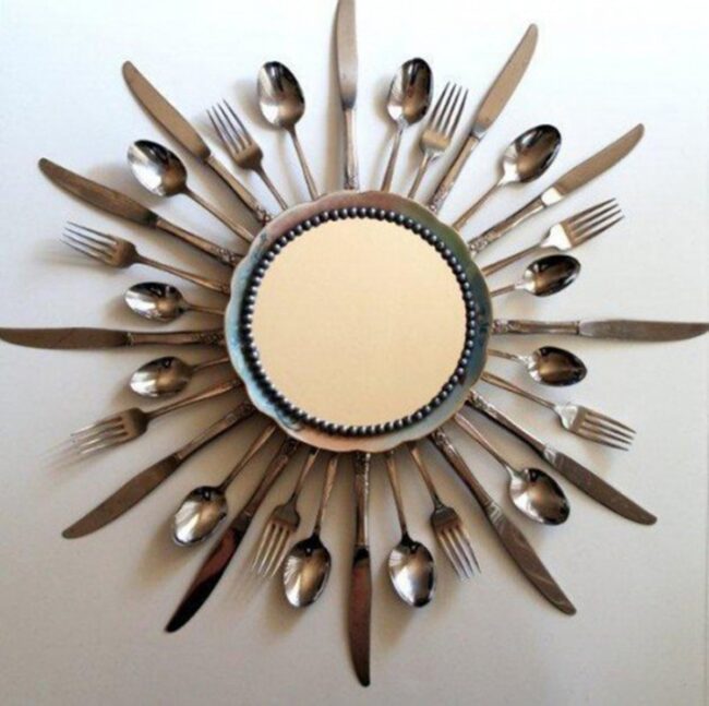 Sunburst wall art brings dynamic energy to any room, reflecting personal style through ingenious recycling of kitchen implements.