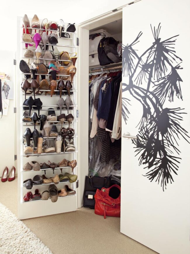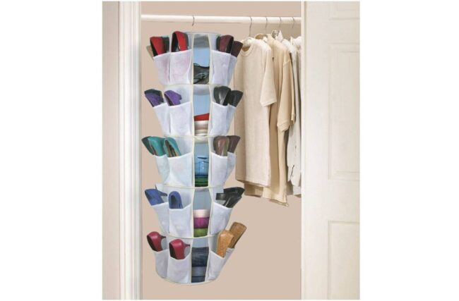 Shoe organizers hanging on doors solve storage challenges by utilizing vertical space completely.