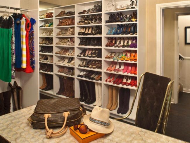 Spacious walk-in closets become shoe havens that display entire collections in stunning clarity.