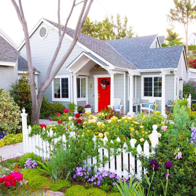 Charming cottage gardens burst with life through carefully selected roses and perennials that frame a white picket fence, creating an enchanting landscape.