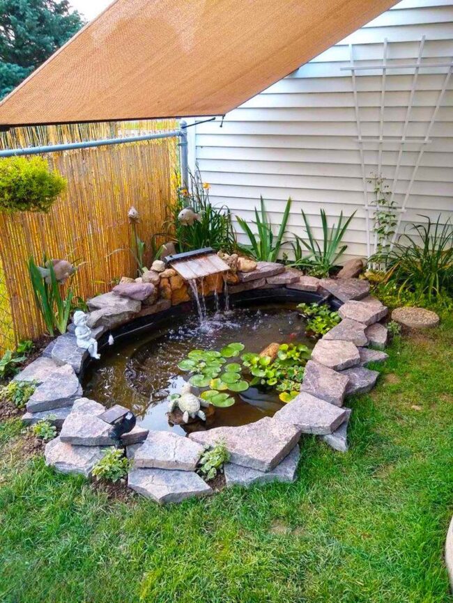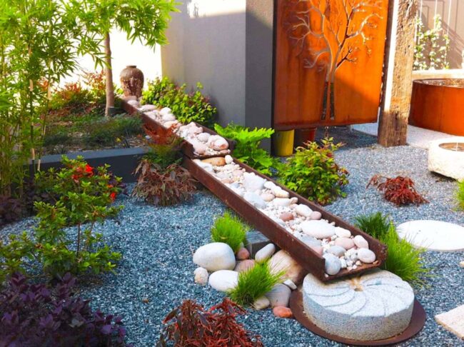 Natural materials like stone and carefully chosen greenery work together to craft a serene environment.