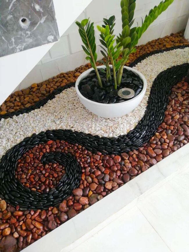 Black and brown pebbles create mesmerizing swirling patterns around a pristine white ceramic bowl housing lush Zamioculcas plants, introducing natural harmony and visual depth.