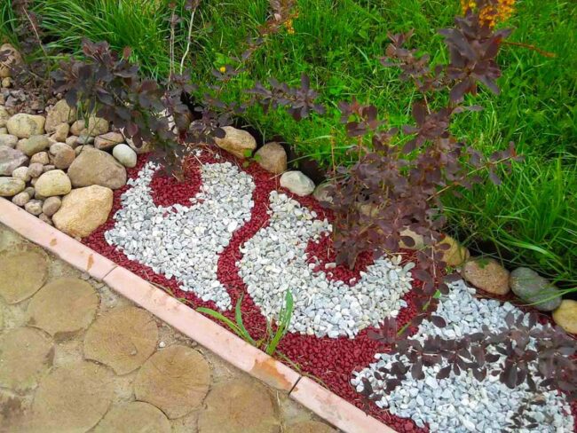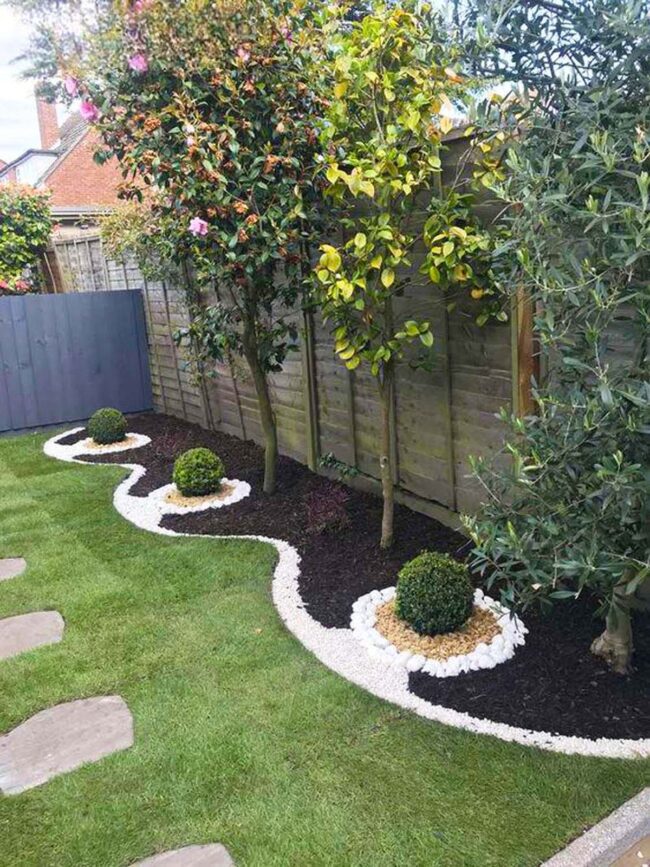 White pebbles curve gracefully against deep brown mulch, creating a mesmerizing landscape canvas that captures immediate attention.
