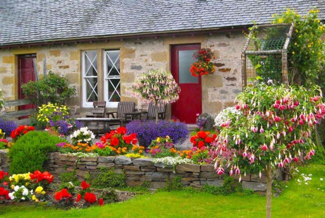 Rustic cottage gardens radiate timeless charm with their enchanting blend of stone structures and lush botanical displays.