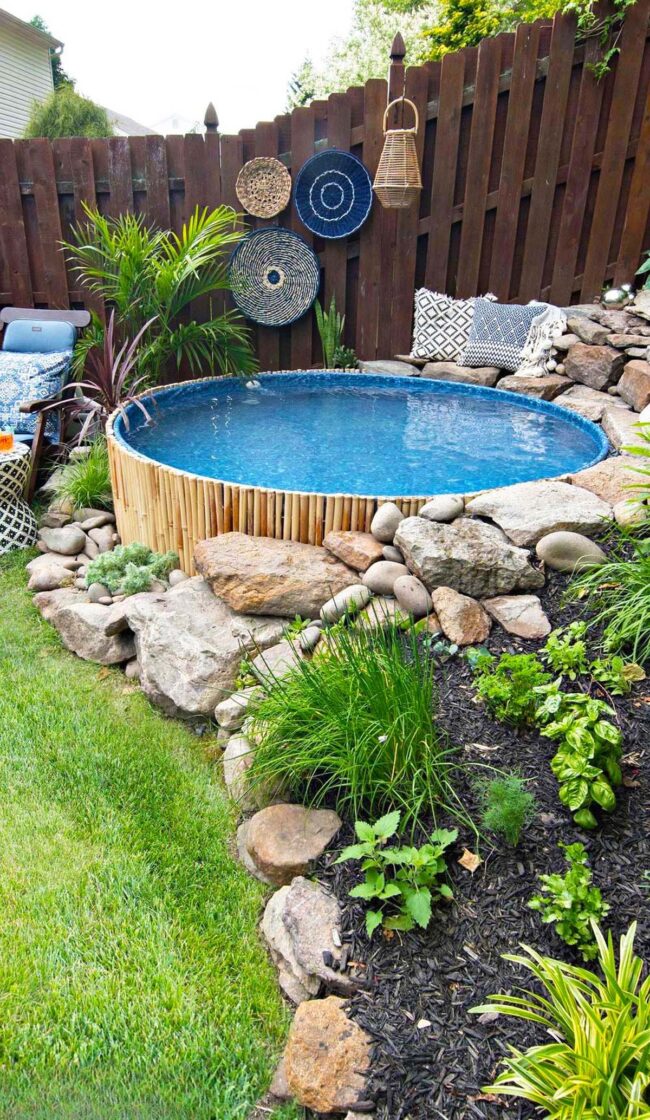 Bamboo panels elegantly surround a circular above-ground pool, creating an inviting backyard sanctuary that beckons relaxation.