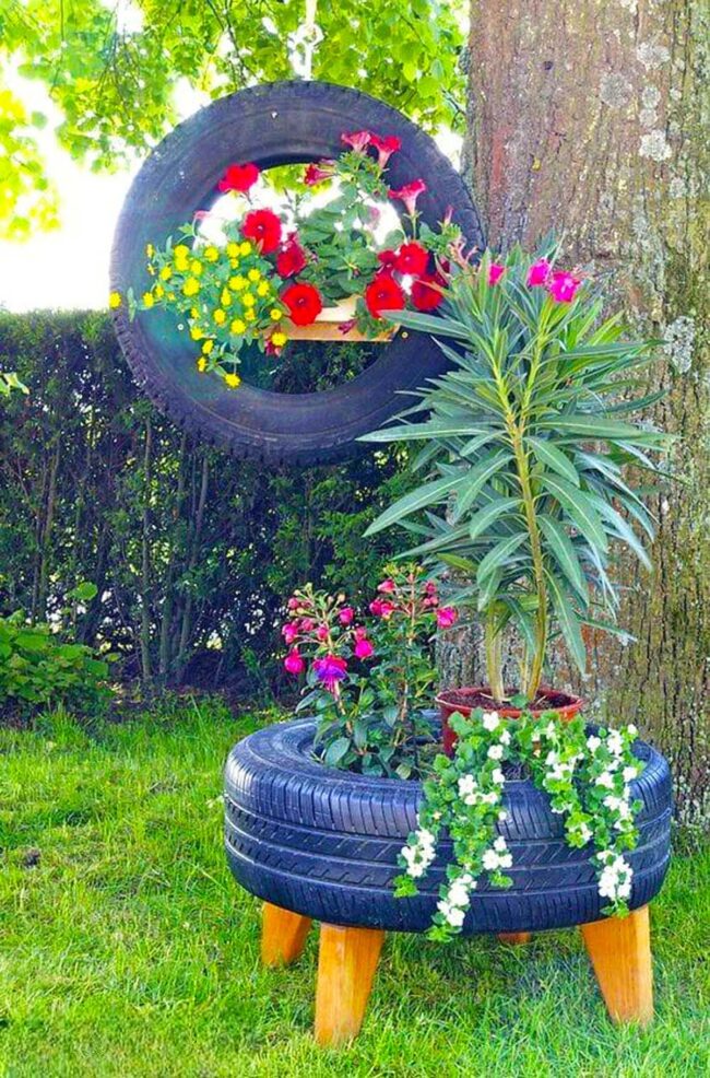 Bold black paint showcases stunning floral arrangements, turning discarded rubber into eye-catching garden focal points.