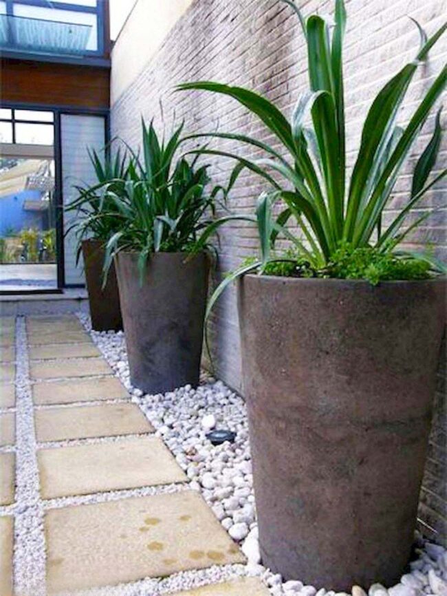 Square stepping stones bordered by white pebbles provide geometric contrast against the vertical plant elements, crafting a striking visual rhythm.