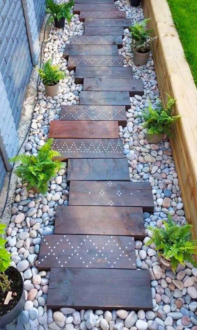 Smooth river stones nestled between wooden boards add textural contrast and gentle guidance through verdant green spaces.