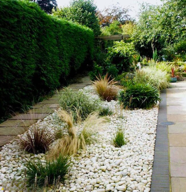 Crisp white pebbles provide stunning contrast against rich green plantings, establishing clean lines and structured pathways.