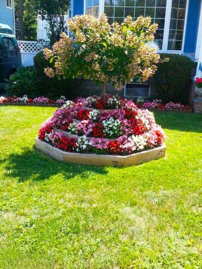 Raised stone beds burst with colorful flowers, creating a picturesque landscape that celebrates natural beauty.