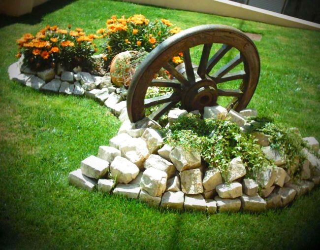 Vintage wagon wheels bring instant charm and historical depth to garden landscapes, offering a nostalgic centerpiece that connects contemporary spaces with rustic heritage.