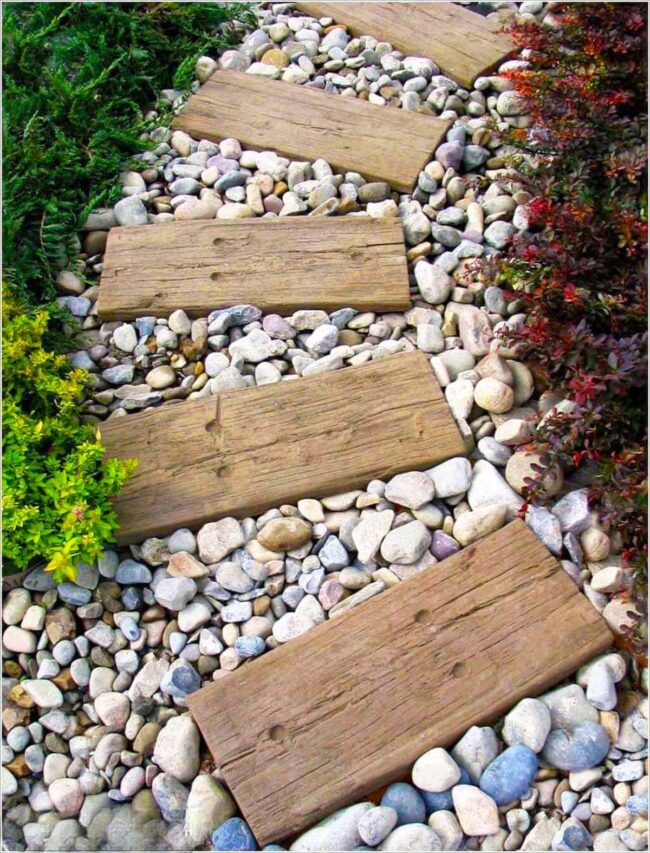 River rocks strategically placed alongside wooden planks add visual interest and provide stable ground for walking.